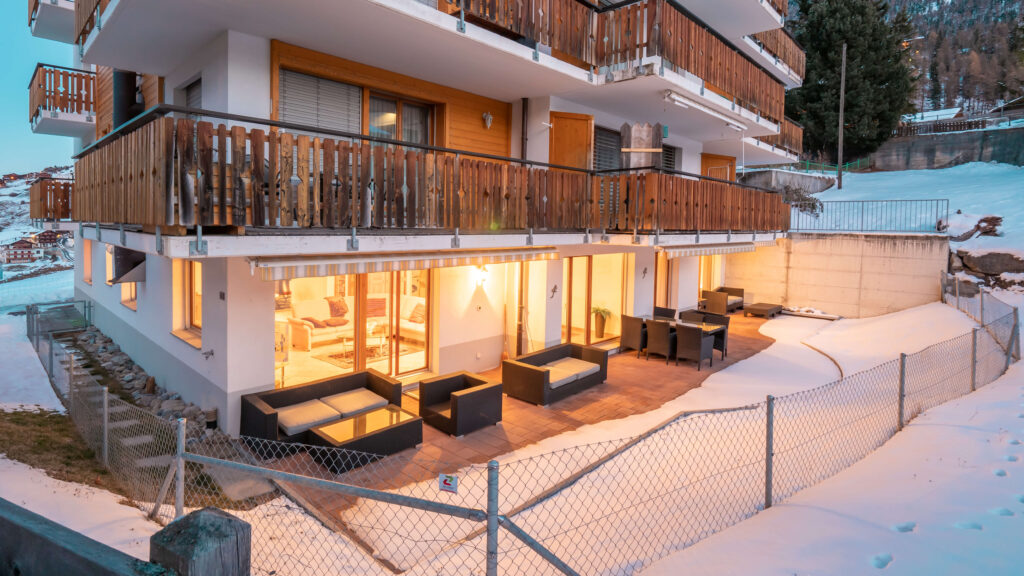 Die 5.5-Zimmerwohnung im Mehrfamilienhaus Arena 1 befindet sich im autofreien Teil von Grächen. Das Parkhaus und die Einkaufsmöglichkeiten befinden sich in einer Gehdistanz von 2 bis 3 Minuten.